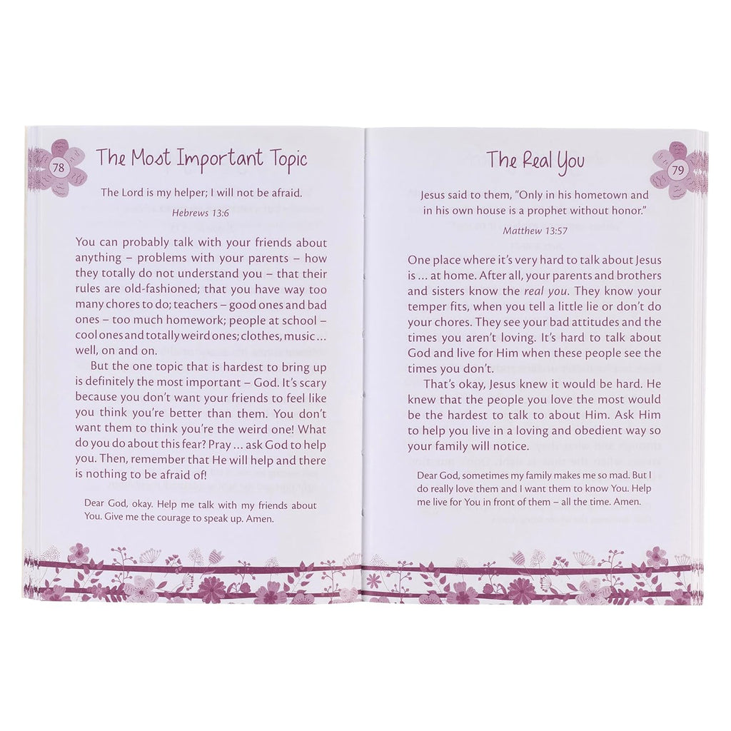 Mini Devotions for Girls offers 180 short and sweet devotions that will help busy girls slow down and take time to grow closer to God. The writing style is relaxed and aimed at young girls. The devotions focus on typical tween-girl issues while at the same time modeling how to live for God. Topics include: Second Chances, Fiery Faith, Make a Difference, Do Your Job, The Real You and many more.